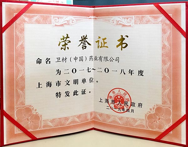 衛(wèi)材中國榮獲2017-2018年度上海市文明單位。