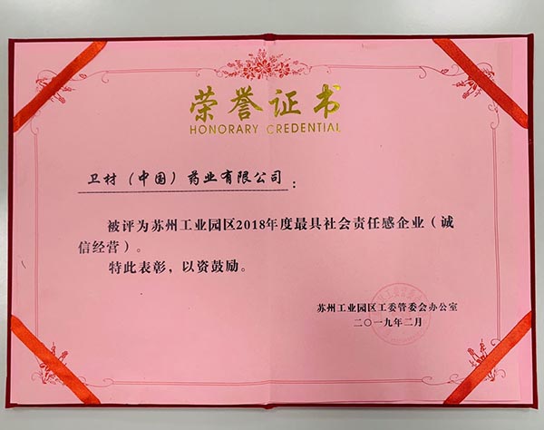 衛(wèi)材中國榮獲蘇州工業(yè)園區(qū)2018年度最具社會責(zé)任感企業(yè)(誠信經(jīng)營)。