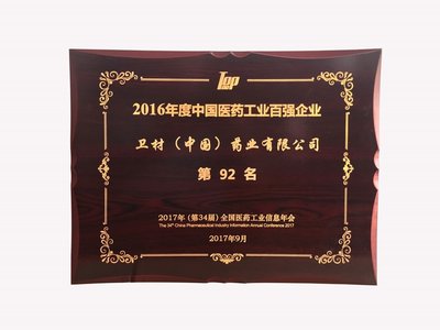 2016年度中國(guó)醫(yī)藥工業(yè)百?gòu)?qiáng)企業(yè)第92名。