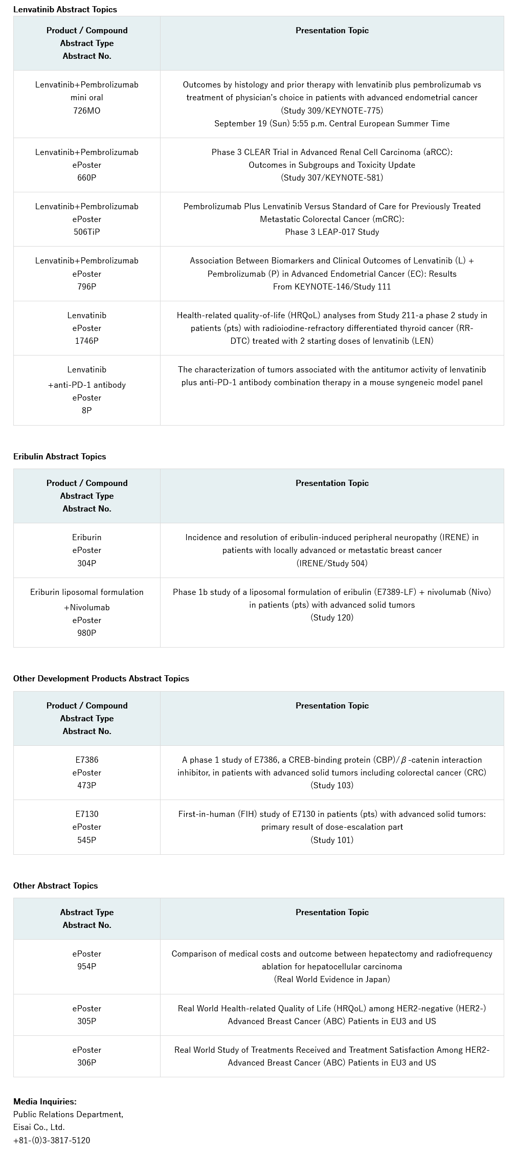 衛(wèi)材將在2021 ESMO虛擬大會(huì)上展示其腫瘤產(chǎn)品及管線摘要