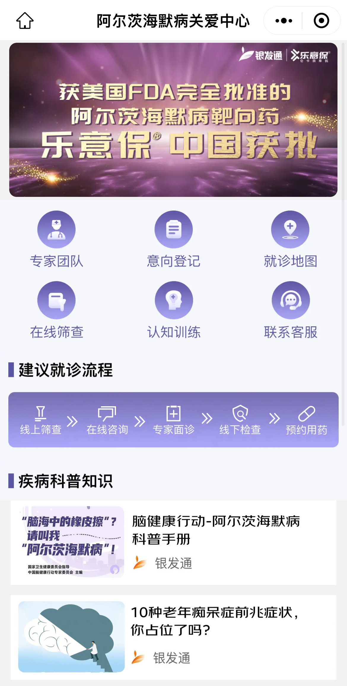 隨著侖卡奈單抗中國獲批,早期延緩AD疾病進展成為可能,當務(wù)之急是幫助潛在患者盡早發(fā)現(xiàn)病情,做好自己的健康守門人。據(jù)了解,公眾可以登錄“銀發(fā)通”微信小程序,找到阿爾茨海默病專區(qū),足不出戶便可以獲得從自篩、初診、用藥到生活護理的一站式信息指導,如通過查詢“記憶地圖”,找到距離最近設(shè)有神經(jīng)內(nèi)科或記憶門診的醫(yī)院,前往診斷治療。