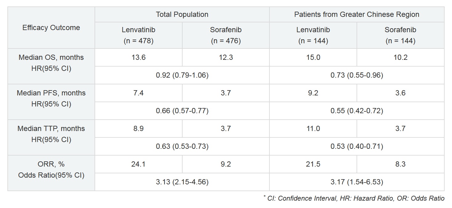 This approval was based on a Phase III clinical study (Study 304 / REFLECT study) conducted by Eisai investigating LENVIMA as a first-line treatment in patients with unresectable HCC. In this study, LENVIMA demonstrated statistically significant non-inferiority of overall survival (OS) (13.6 months) compared to sorafenib (12.3 months) (hazard ratio [HR] 0.92, 95% confidence interval [CI]=0.79-1.06). Additionally, LENVIMA showed highly statistically significant and clinically meaningful improvements as compared to sorafenib in the secondary endpoints of progression free survival (PFS) (HR 0.66, 95% CI=0.57-0.77, p<0.00001), time to progression (TTP) (HR 0.63, 95% CI=0.53-0.73, p<0.00001), and objective response rate (ORR) (LENVIMA 24% versus sorafenib 9%, p<0.00001). Furthermore, LENVIMA helped to delay deterioration in several quality of life (QOL) and symptom domains (pre-specified secondary endpoint) including in areas such as pain and diarrhea, compared to sorafenib (nominal p-value<0.05).